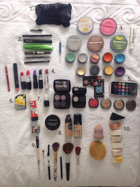 Top 3: Greens, blues and purple shades of eyeshadow were used to contour the rest of the face, then a blue eyeliner to outline the shape of the oversized lips. Shading and blending were big aspects to making this a successful drag look! The same blending applied to the lips, to give an impression of them seeming bigger than they actually are. This was done through using a darker liner, and a lighter colour in the centre of the lips. I gradiated from dark blue and black through to a lilac centre shade.